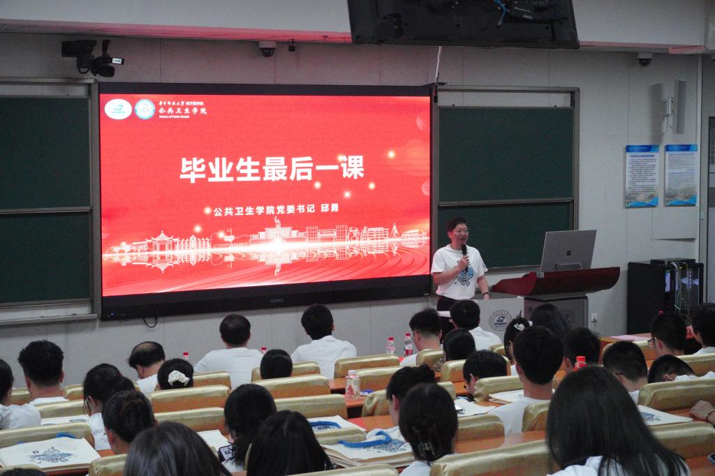 邱勇为毕业生讲授毕业前最后一课。他首先代表学院对同学们顺利完成阶段性学业表示衷心祝贺,并感谢了学院老师对学生的悉心栽培和指导。他希望同学们胸怀国之大者,将个人理想融入时代洪流,关注国家公共卫生体系改革和健康中国建设;融入“同舟共济”之魂,在集体协作中凝聚力量,强化跨界的协作能力,成为团队中可靠的成员;砥砺技术之志,保持终身学习的习惯和对新技术的追求,培养批判思维和独立思考能力,坚守科学诚信底线,清正廉洁、公平正义,培养强大的心理韧性和抗压能力。最后,他祝愿全体毕业生在守护人民健康的伟大事业中乘风破浪、济世安民,成就无愧于时代、无愧于青春、无愧于公卫人的辉煌人生。
