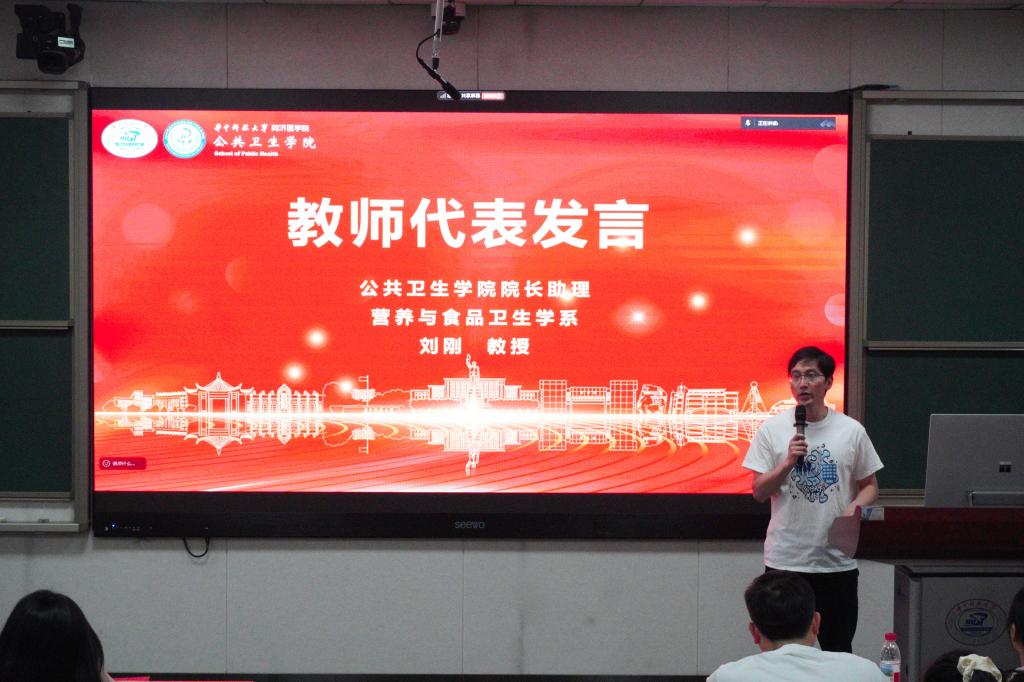 教师代表、营养与食品卫生学系刘刚教授代表全体教师祝贺毕业生顺利完成学业,并以“三心一意”为关键词,与同学们分享关于如何应对新阶段的迷茫与困惑的思考。他希望同学们始终保持信心、恒心、平常心,要肯定自己曾经取得的成长与进步,坚定目标,全力以赴,应对新岗位上的困难与挑战,也要学会与自我和解,平衡好工作与生活。他寄语全体毕业生将个人理想和热爱融入到国家的需求中,找寻工作的意义与价值,保持热情和动力,做出不平凡的成绩。