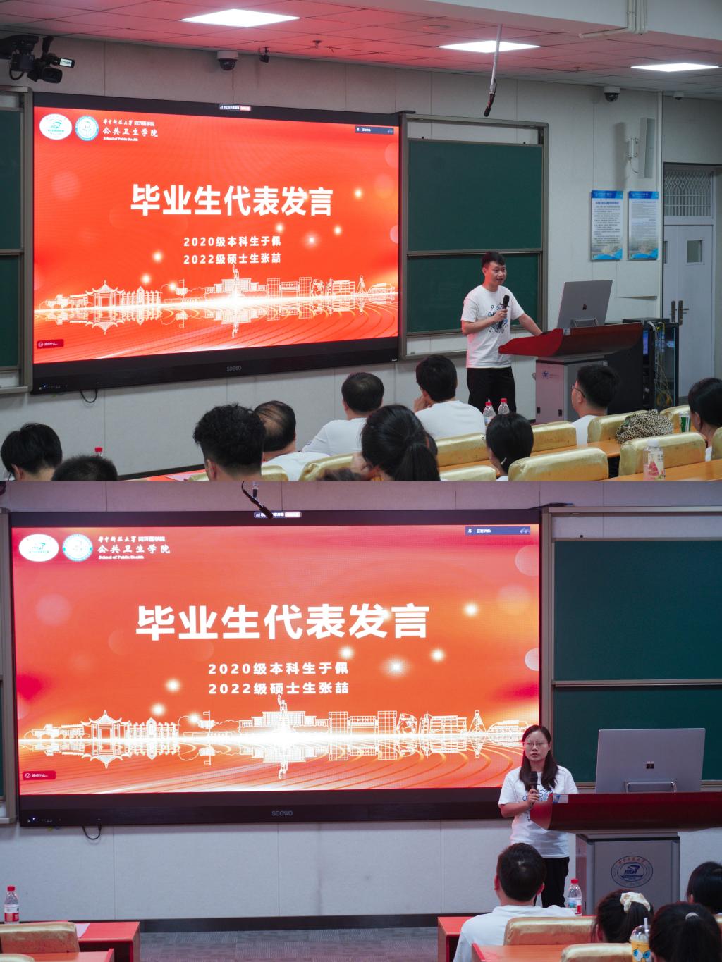 2020级本科生于佩、2022级硕士生张喆作为毕业生代表进行发言。他们回顾了在华科大同济公卫拼搏、成长的经历,并代表全体毕业生,向学校、学院及老师们的悉心指导与帮助表达诚挚的谢意。于佩表示,课堂内外的实践锻炼让她将公卫精神内化于心、外化于行。未来,她将深耕公共卫生领域,努力成为一名合格的公卫人,为学院发展贡献青春力量。张喆表示研究生阶段的奋斗与收获都让他真切感受到公共卫生事业的发展脉搏,深刻意识到公卫人的责任与担当。在新的工作岗位上,他将秉持专业精神与热忱,践行公卫人的初心,继续书写守护人民健康的答卷。