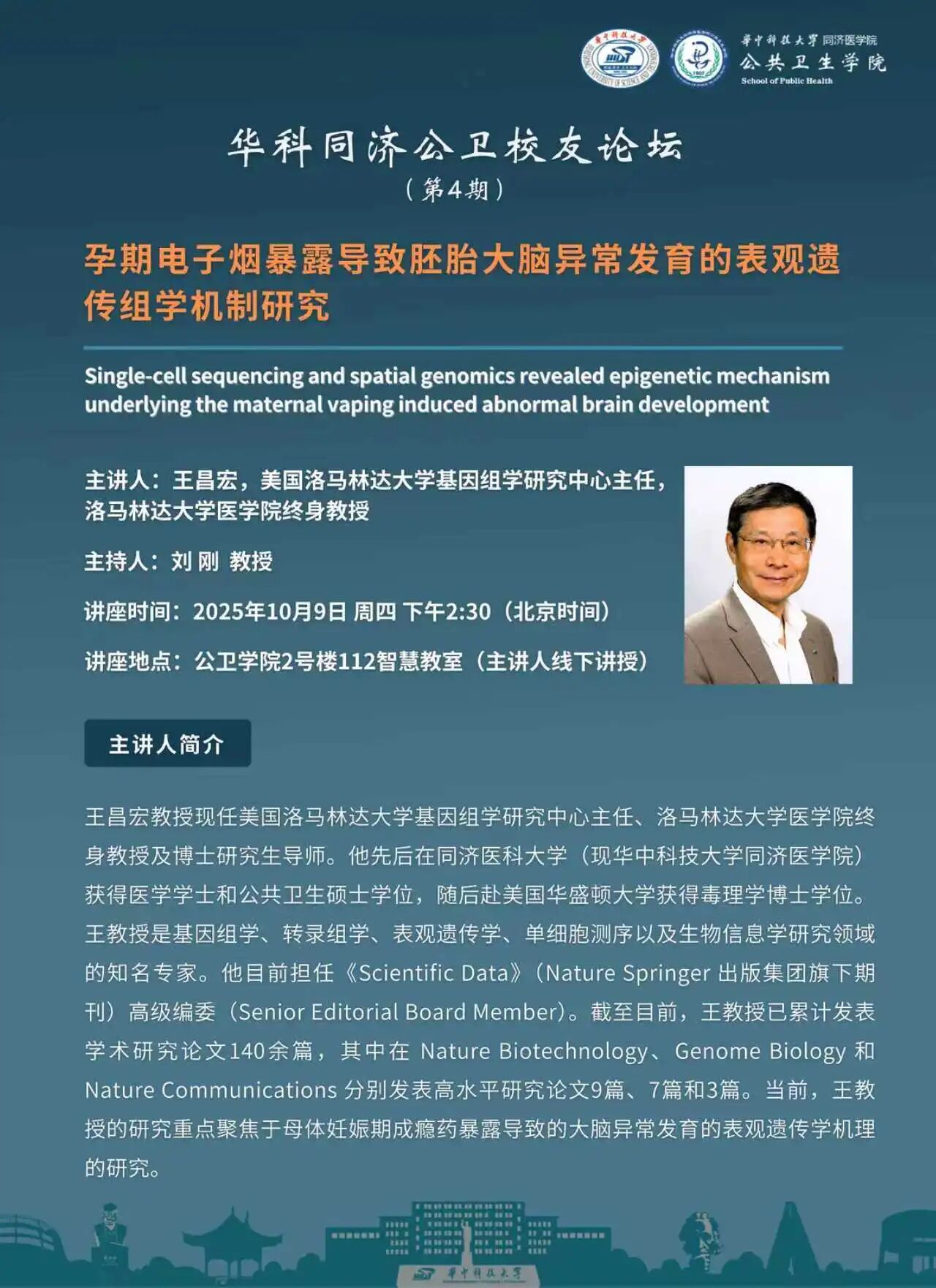 10月9日下午,公共卫生学院特邀美国洛马林达大学基因组学研究中心主任、医学院终身教授王昌宏教授,举办题为“孕期电子烟暴露导致胚胎大脑异常发育的表观遗传组学机制研究”的主题讲座。欢迎广大师生线下观看!