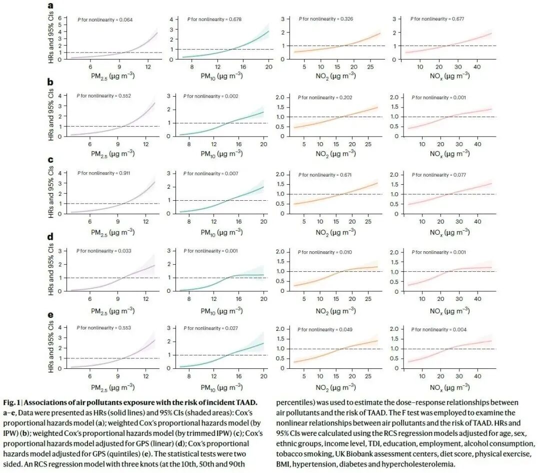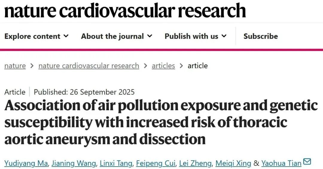 在前期研究基础上,华中科技大学公共卫生学院田耀华教授团队进一步深耕,于2025年9月26日在Nature Cardiovascular Research发表研究论文“Association of air pollution exposure and genetic susceptibility with increased risk of thoracic aortic aneurysm and dissection”。研究发现,空气污染暴露与胸主动脉瘤发病风险之间的暴露-反应关系曲线呈现出单调上升的趋势,遗传-环境交互作用对这种关联具有关键影响。
