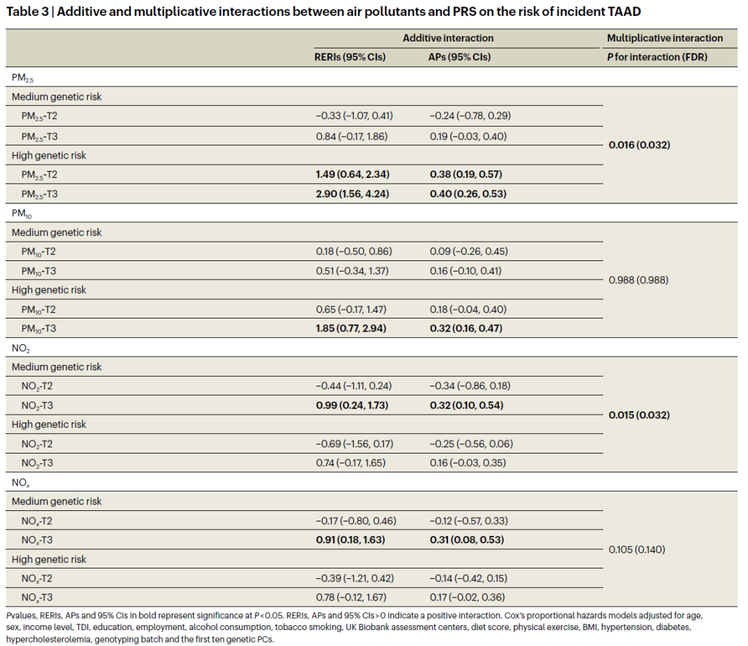 综上,该研究结合传统Cox比例风险模型和逆概率加权与广义倾向性评分等统计模型,有效控制了混杂因素的影响,从而在一定程度上模拟了空气污染暴露的随机分配,增强了研究结论的可靠性。此外,对遗传-环境交互作用的探讨进一步加深了对空气污染长期暴露在胸主动脉瘤发生机制中作用的理解。总体而言,该研究不仅补充了关于空气污染作为胸主动脉瘤重要环境危险因素的流行病学证据,而且也拓展了对遗传-环境交互作用在疾病发生与进展中作用的认识,对精准防控和高危人群识别具有重要公共卫生意义。
