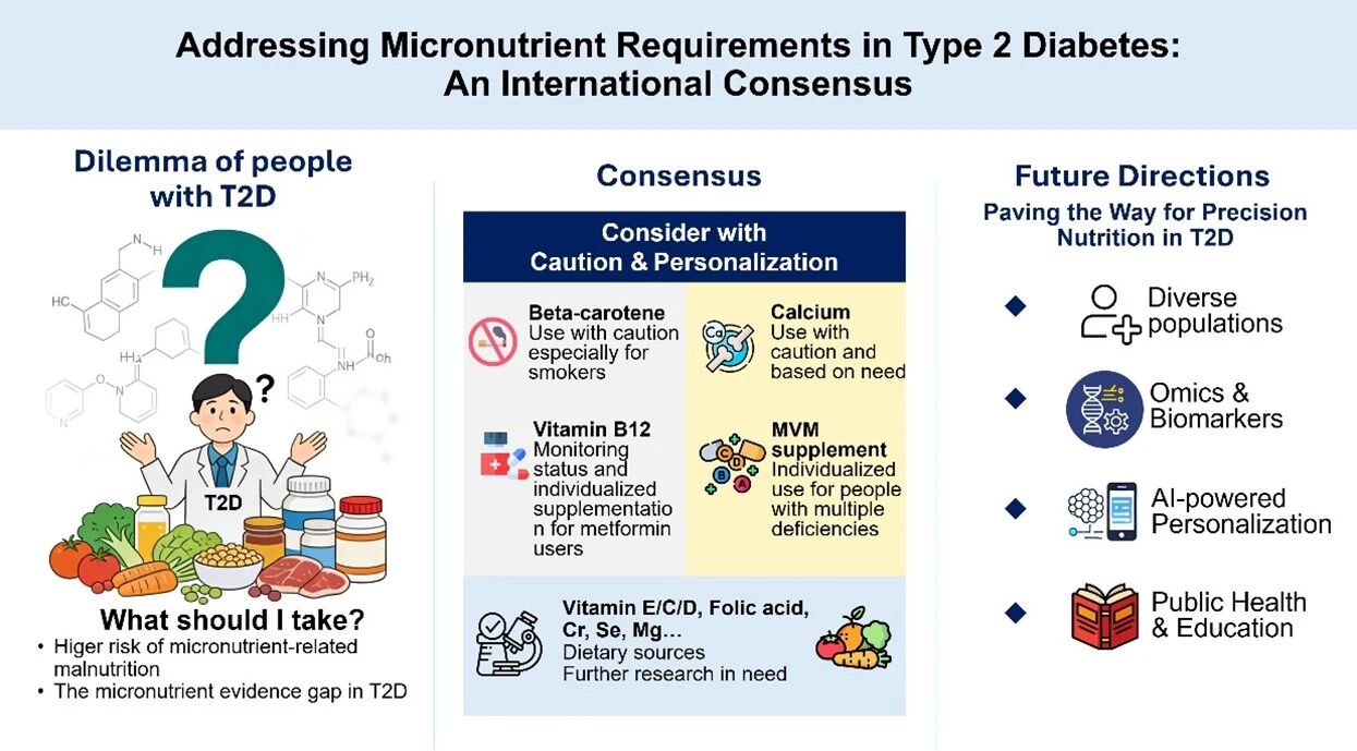 本共识指出,目前亟需开展更多涵盖多样化种族与地域人群的高质量研究,以明确糖尿病患者中微量营养素与健康结局的剂量-反应关系及最佳干预阈值。此外,未来研究应结合多组学技术,并利用人工智能(AI),开发针对个体遗传与代谢特征的精准营养干预策略。