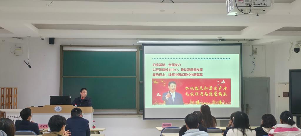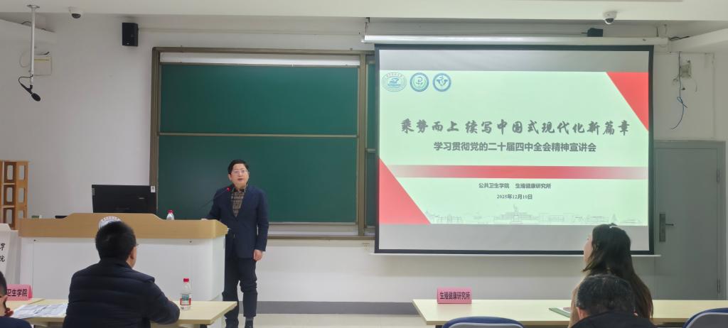 为深入学习宣传贯彻党的二十届四中全会精神,推动全会精神在基层落地生根,12月10日下午,公共卫生学院与生殖健康研究所联合举办党的二十届四中全会精神专题宣讲会。本次宣讲会特邀学校宣讲团专家、经济学院副院长钱雪松教授作“乘势而上-续写中国式现代化新篇章”专题报告。公共卫生学院党委书记邱勇主持,公共卫生学院、生殖健康研究所师生100余人参加学习。